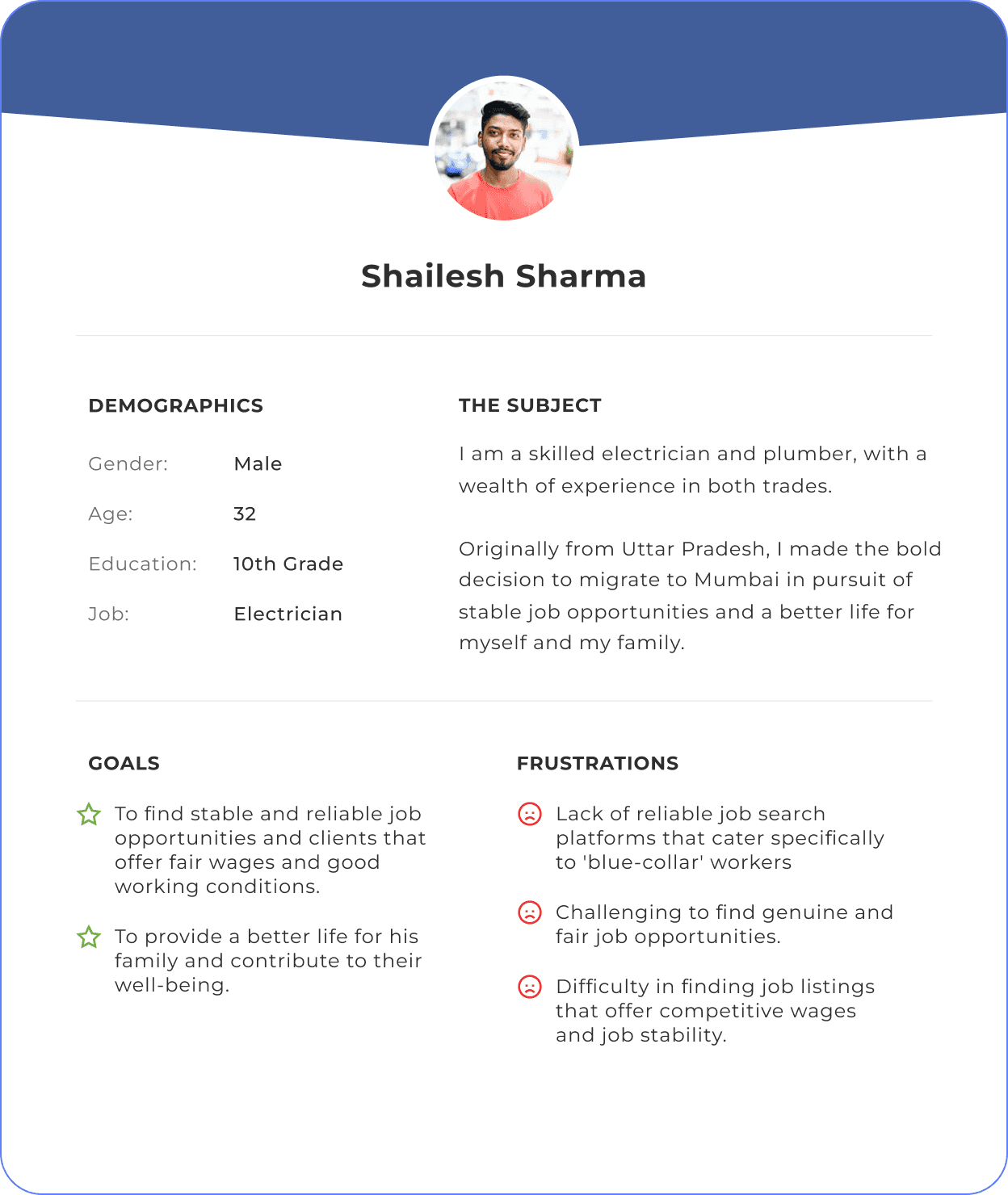 Here I have provided the User Journey Map of one of the workers I interviewed, Shailesh Sharma. He is a skilled electrician and plumber from Uttar Pradesh who migrated to Mumbai in search of stable job opportunities.
