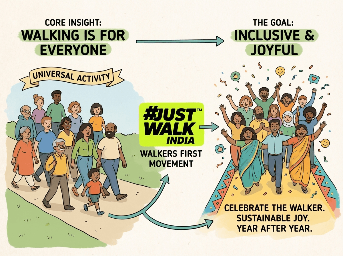 The core insight behind #JustWalkIndia was simple: walking is the one physical activity almost everyone does, across age, fitness level, and background — yet it rarely gets celebrated.