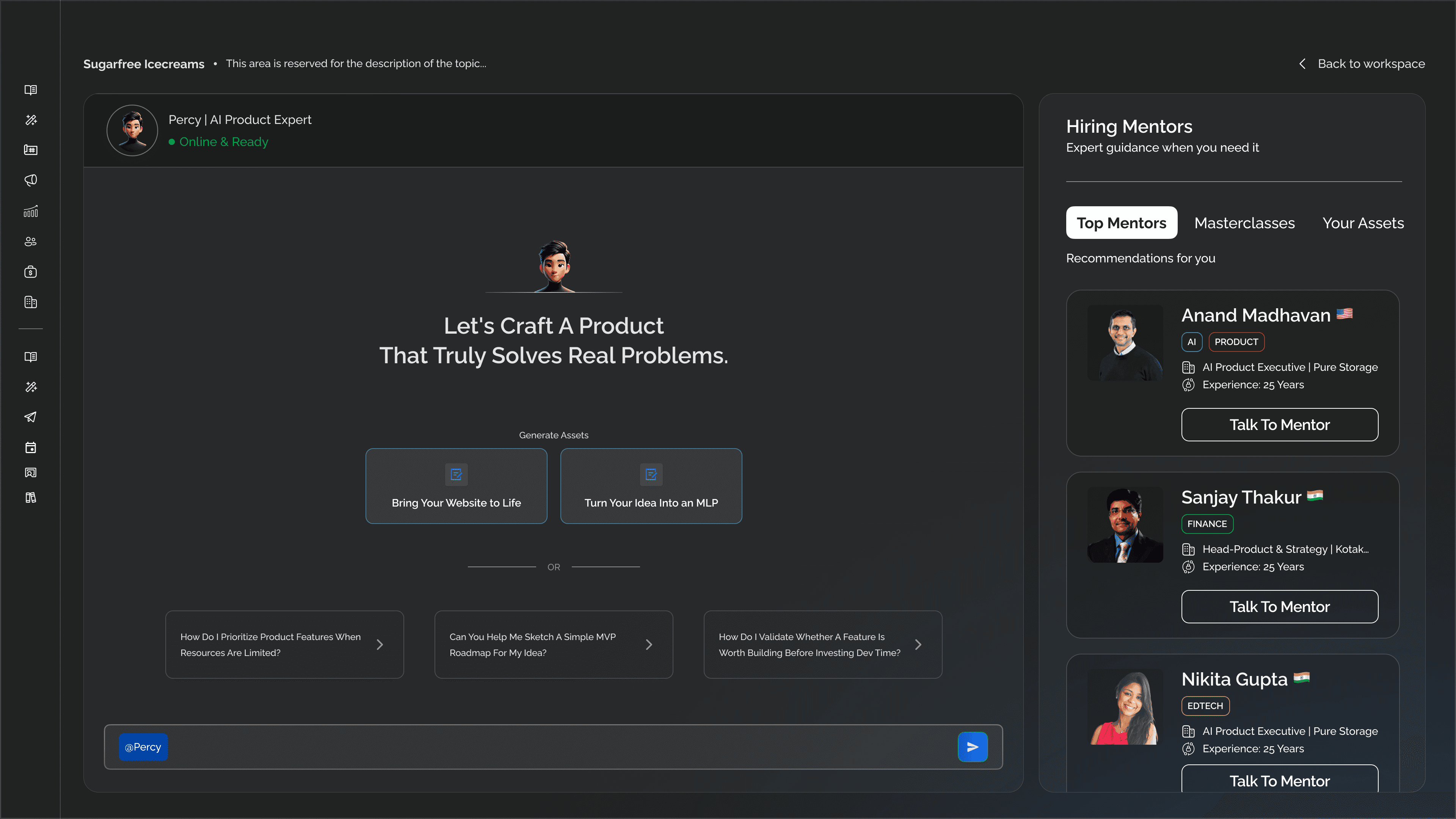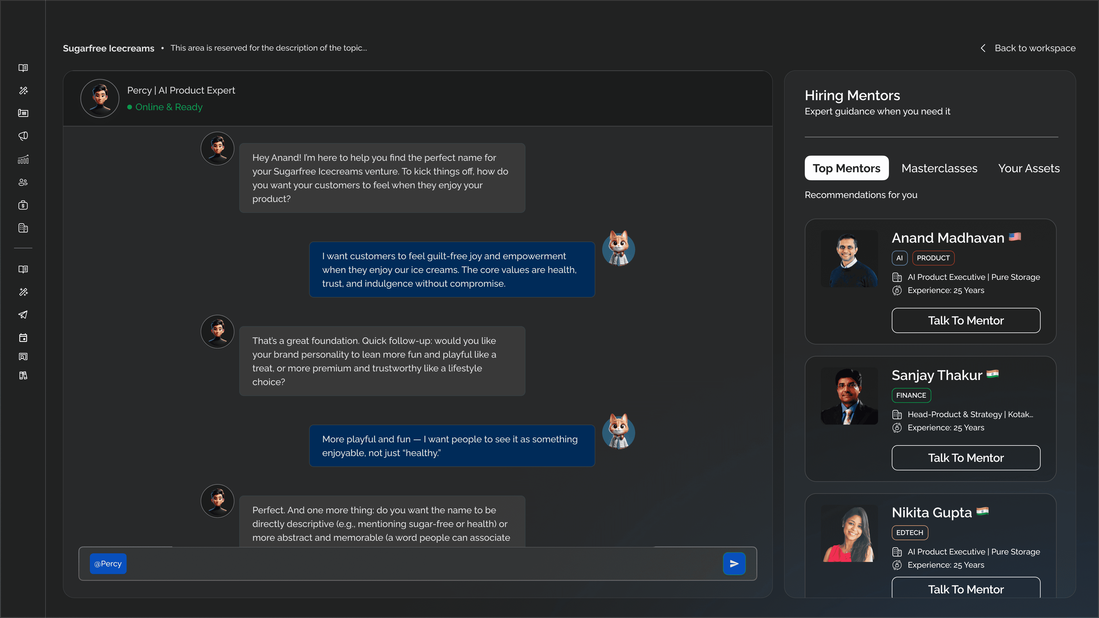 Designing the interaction model where founders would brief a relevant AI co-founder (e.g., Product co-founder “Percy” for PRDs)