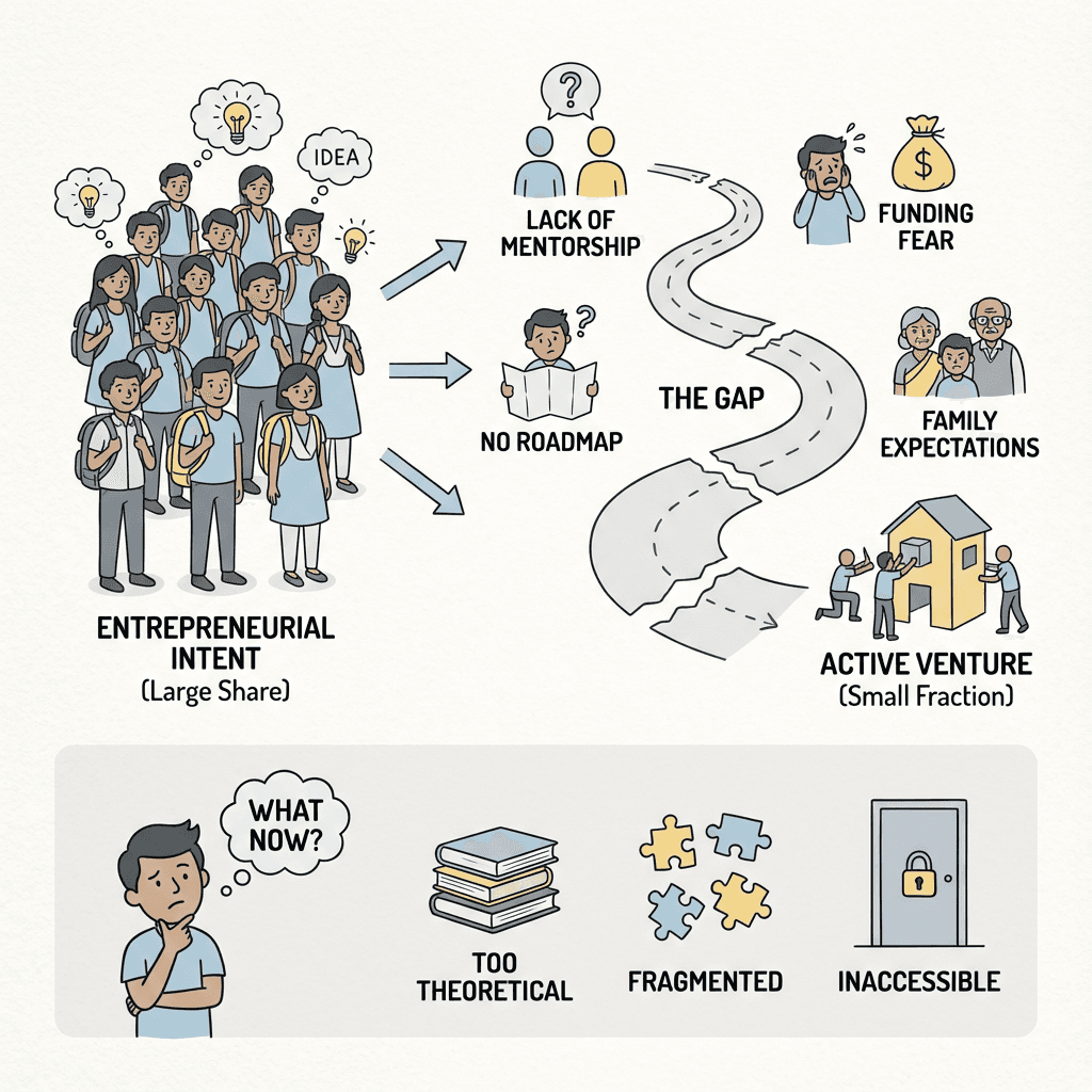 Research and surveys show that a large share of Indian students express entrepreneurial intent, yet only a small fraction actively build and commit to a venture, often due to lack of mentorship, structured roadmaps, and fear around funding and family expectations.